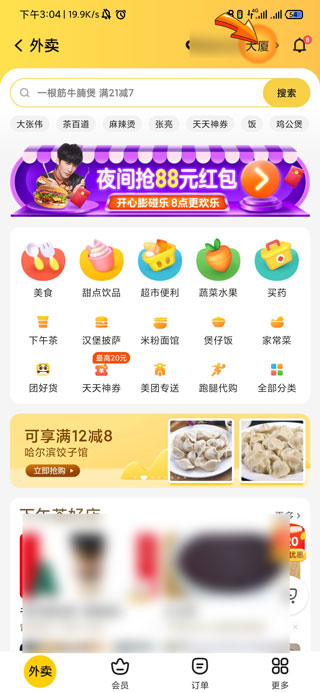 2、进入外卖界面后,点击页面右上角的“地址”选项。