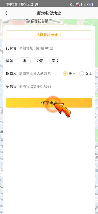 4、再将朋友的地址填写详细,点击“保存地址”选项,点外卖时将地址更改为朋友的地址即可。