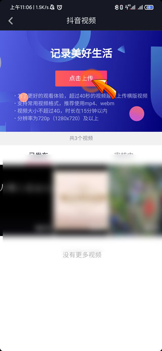 5、最后点击记录美好生活下方的“点击上传”选项,就可以上传3分钟以上长时间的视频了。