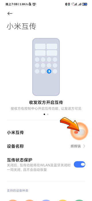 4、最后将“小米互传”右侧的开关打开,两部手机会自动检索到对方,即可互传软件。