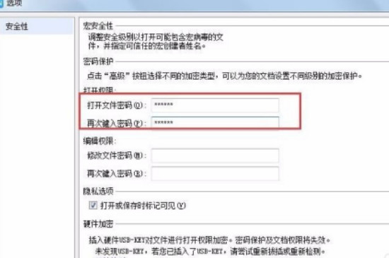 2、在新的下拉菜单可以看到“文件加密”的选项,之后点击“文件加密”选项。弹出新的对话框后,输入打开文件的密码并在此输入确认密码。
