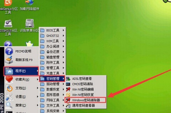 登录到大白菜pe系统桌面,点击依次展开:开始菜单,程程序, 密码管理,Windows密码清除器,打开密码清除器。