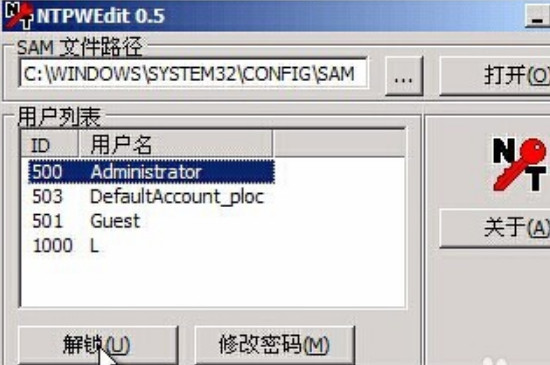 在打开的密码清除器窗口中,点击“打开(O)”按钮,点击选中需要进行密码清除的用户帐户,然后点击“解锁(U)”按钮。