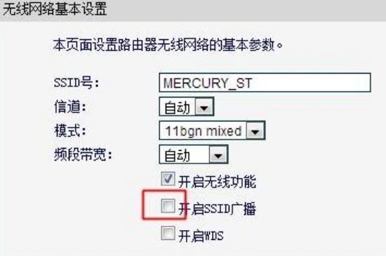 3、在无线网络基本设置界面内将“开启无线广播”旁边的勾取消,wifi就只能通过输入名称的方式查找到。需要注意也有的界面会将“开启无线广播”叫做“开启SSID无线广播”或“隐藏SSID”。