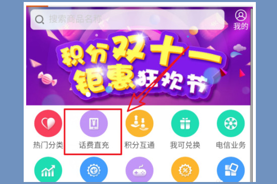 此时在主页面可以看到下方有一排功能选项,点击“积分兑换”之后进入跳转页面,再选择“话费直充”选项。