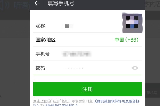 下载微信后,打开进入登录页面,点击页面上的注册“按钮”进行信息的填写。填写微信的昵称,选择自己喜欢的头像,并输入需要绑定的手机号。然后再输入密码,确认后点击立即注册进行申请。