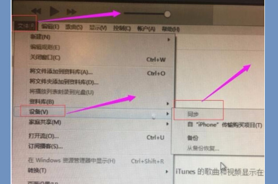 登录iTunes之后,使用数据线连接电脑和手机,打开iTunes软件中的“文件”选项。然后继续打开“设备”选项后点击同步,如果同步是灰色的不能选中,那就证明此时iTunes已经和手机同步了,此时拖入铃声就可以同步到手机里。