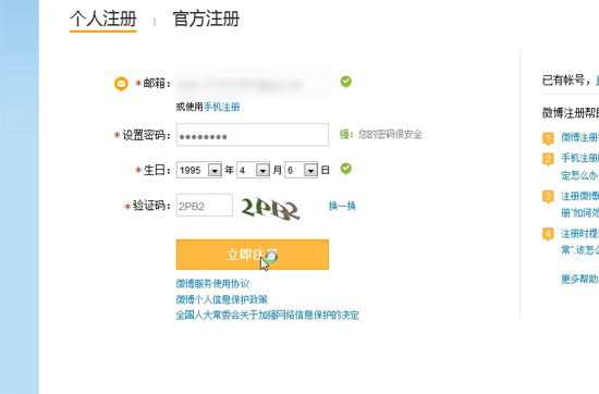 电脑打开浏览器后搜索新浪微博,再点击进入微博登录界面并点击立即注册,之后再选择邮箱或手机号注册并输入邮箱或手机号,输入密码、生日和短信验证码,再点击立即注册即可完成微博注册。
