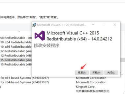 右击C++2015(64),卸载,会出现修复选项,点击修复,修复完成。