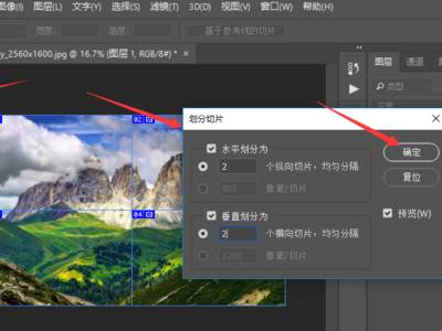 在左边工具栏中选择“切片工具”,在图片上选择“划分切片”,在对话框中选择数量单击“确定”即可。
