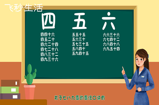四、五、六乘的乘法口诀有四四十六、四五二十、四六二十四、四七二十八、四八三十二、四九三十六、五五十五、五六三十、五七三十五、五八四十、五九四十五、六六三十六、六七四十二、六八四十八、六九五十四。